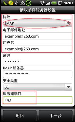 3. 在“接收邮件服务器设置”页面,设置接收邮件服务器的信息,以及邮件地址、用户名和密码,用户名字段可以任意填写。(注:所有项均为必填项,特别要注意一定要填写发件人的用户名及密码)