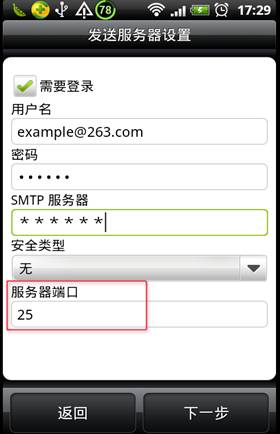 4. 点击下一步,在“发送邮件服务器设置”页面设置发件服务器的信息(注:所有项均为必填项,特别要注意一定要填写发件人的用户名及密码)